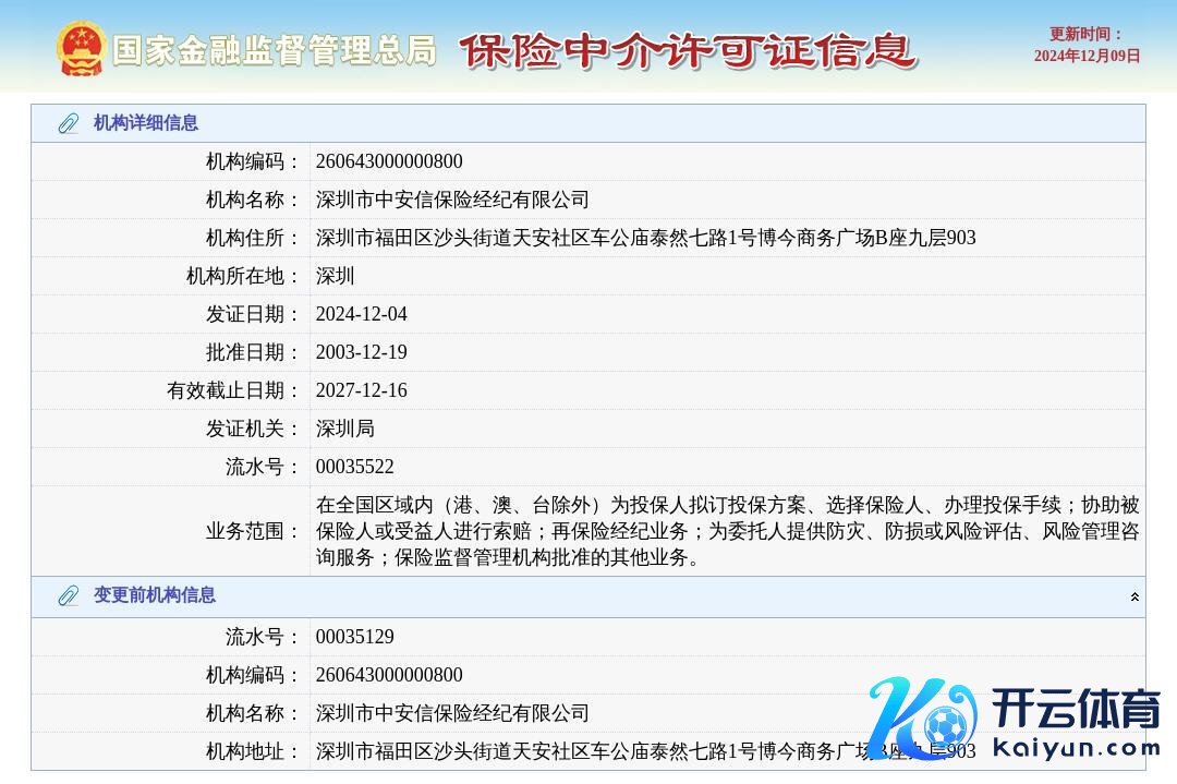 12月9日,凭据国度金融监管总局许可证信息查询平台,深圳市中安信保障经纪有限公司换发保障中介许可证,发证日历2024年12月4日。