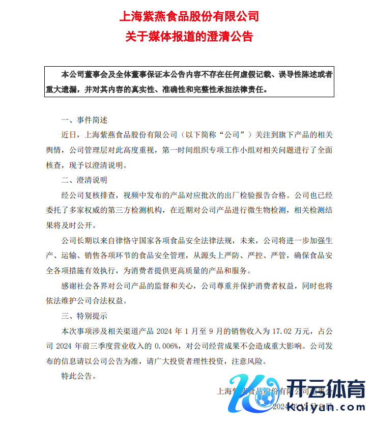 12月9日,紫燕食物再次发布廓清公告称,经公司复核排查,视频中发布居品对应批次的出厂磨练陈连系格。公司已委派多家巨擘的第三方检测机构,在近期对公司居品进行微生物检测,相关检测末端将实时公开。廓清公告还提议,本次事项波及相关渠谈居品2024年1月至9月的销售收入为17.02万元,占公司2024年前三季度贸易收入的0.006%,对公司谋略后果不会变成紧要影响。