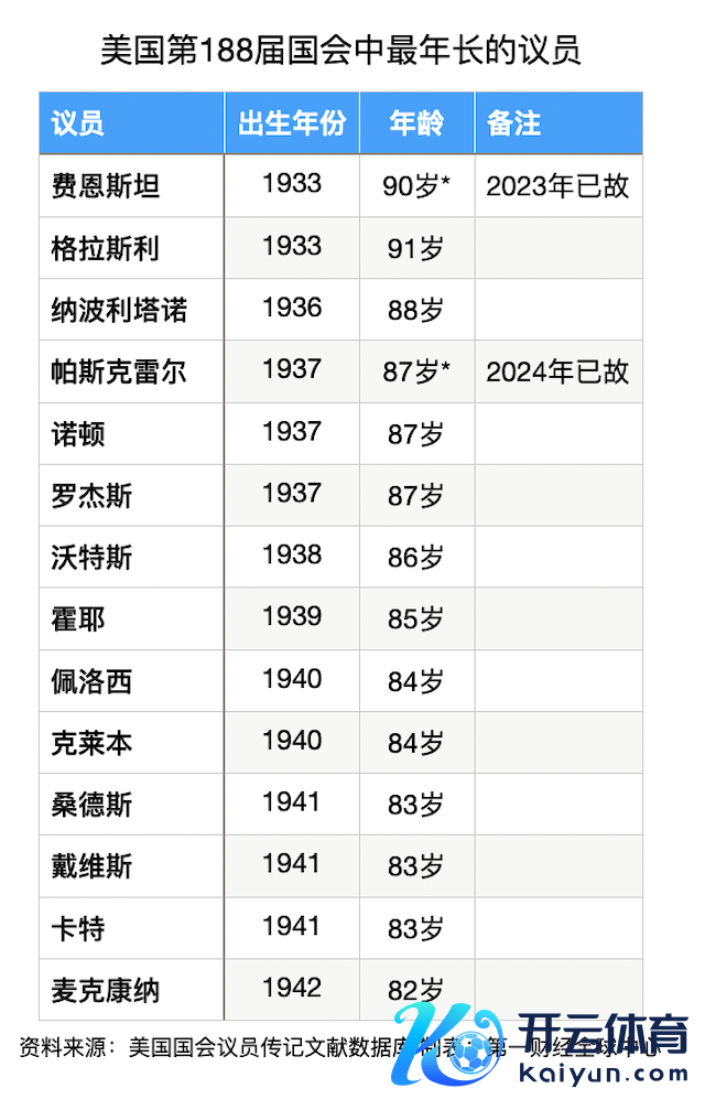 凭据好意思国国会议员列传文件数据库,第118届国会已成为好意思国“最老”的一届国会。总计讨论员和众议员的年事中位数为59岁,其中讨论员的年事中位数为65岁,创下历史新高,众议员的年事中位数约为58岁。皮尤谈论中心的统计发现,讨论院中跨越70岁的议员占比高达34%,众议院这一比例为16.6%。