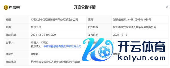 来自杭州市临安区作事东说念主事争议仲裁委员会(简称:临安劳仲委)的浙杭临安劳东说念主仲案(2024)958号案久了,当事东说念主徐某某向中信证券股份有限公司浙江分公司(下称“中信浙分”)发起仲裁,主诉“加班工资”。临安劳仲委将于2024年12月25日开庭审理。