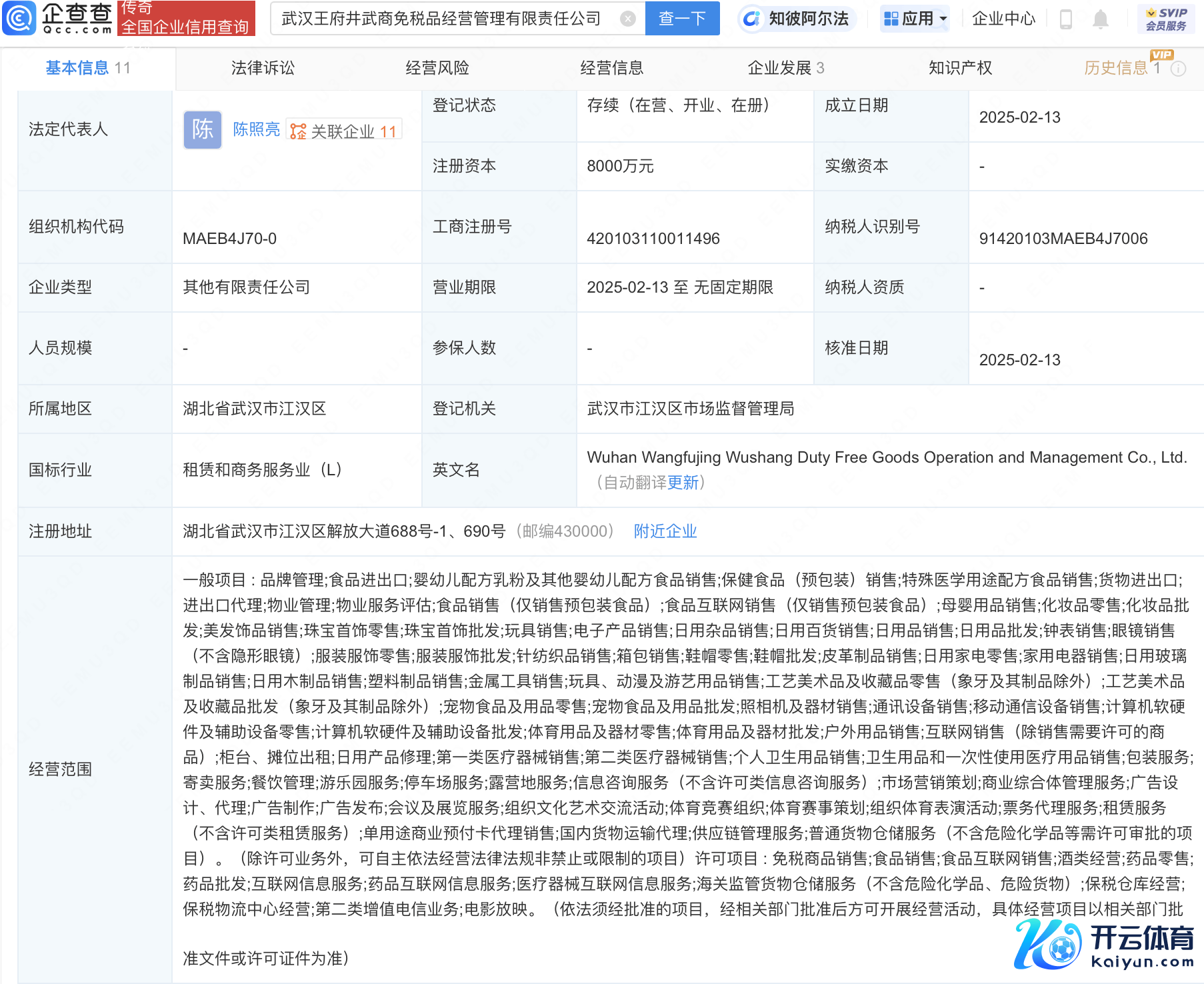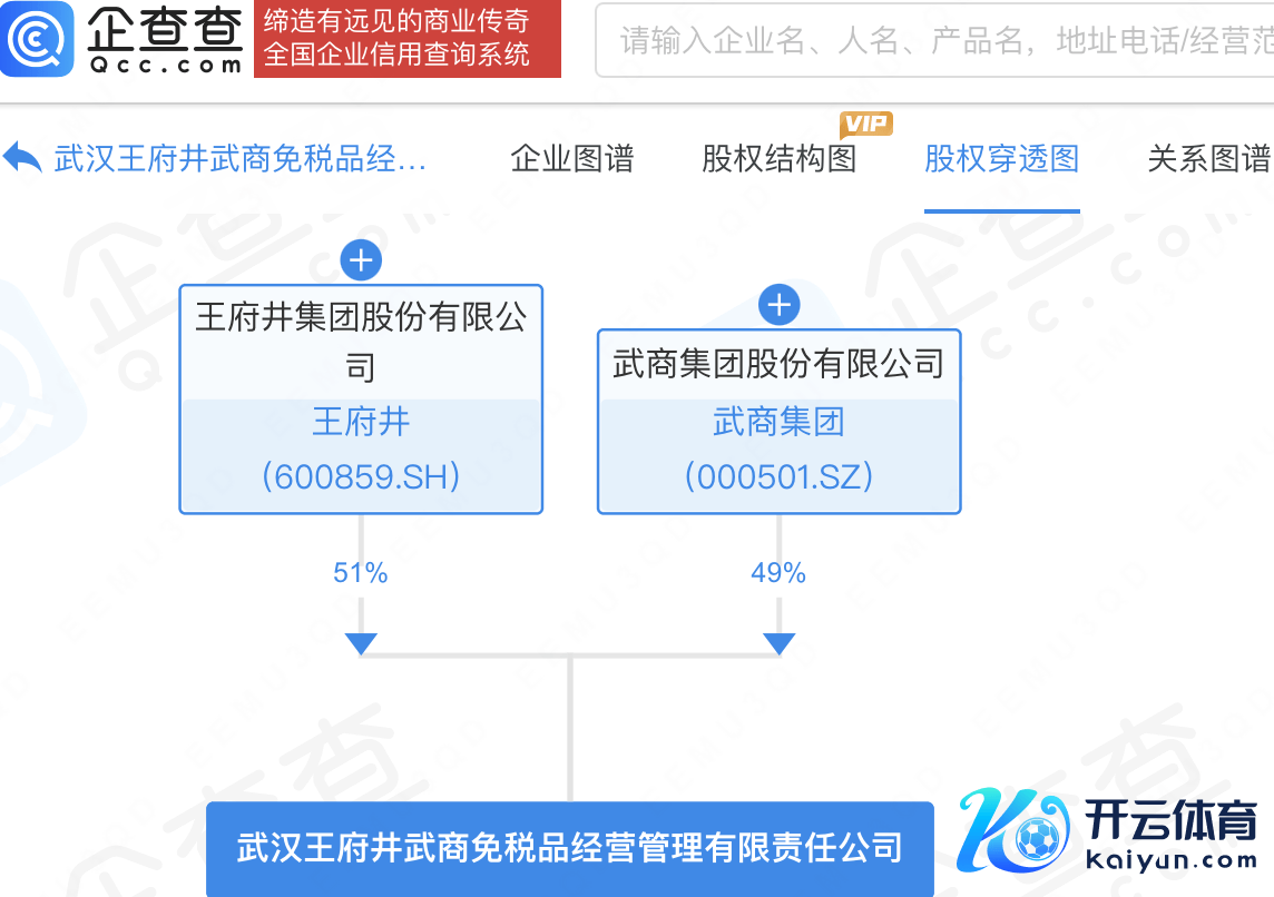 企查查APP涌现开云体育,近日,武汉王府井武商免税品宗旨处理有限包袱公司诞生,法定代表东谈主为陈照亮,注册成本8000万元,宗旨范围包含:保税仓库宗旨;保税物流中心宗旨;第二类升值电信业务;电影放映等。企查查股权穿透涌现,该公司由王府井(600859)、武商集团(000501)共同执股。
