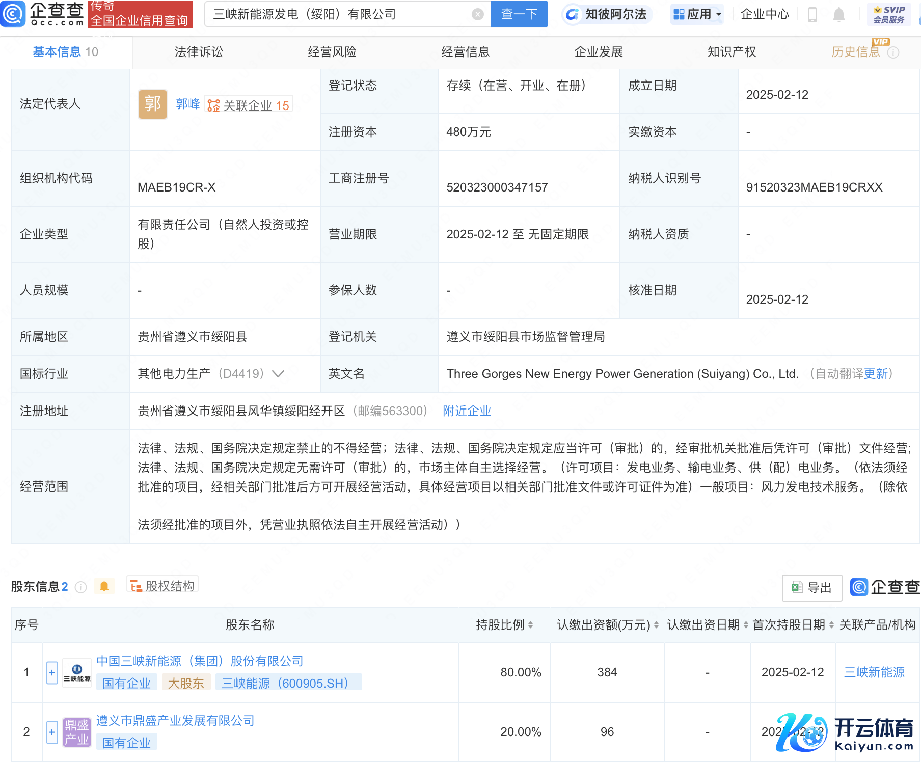企查查APP露出,近日,三峡新动力发电(绥阳)有限公司诱骗,法定代表东说念主为郭峰,注册成本480万元,猜度范畴包含:发电业务、输电业务、供(配)电业务;风力发电时间行状。企查查股权穿露馅出,该公司由三峡动力(600905)等共同抓股。