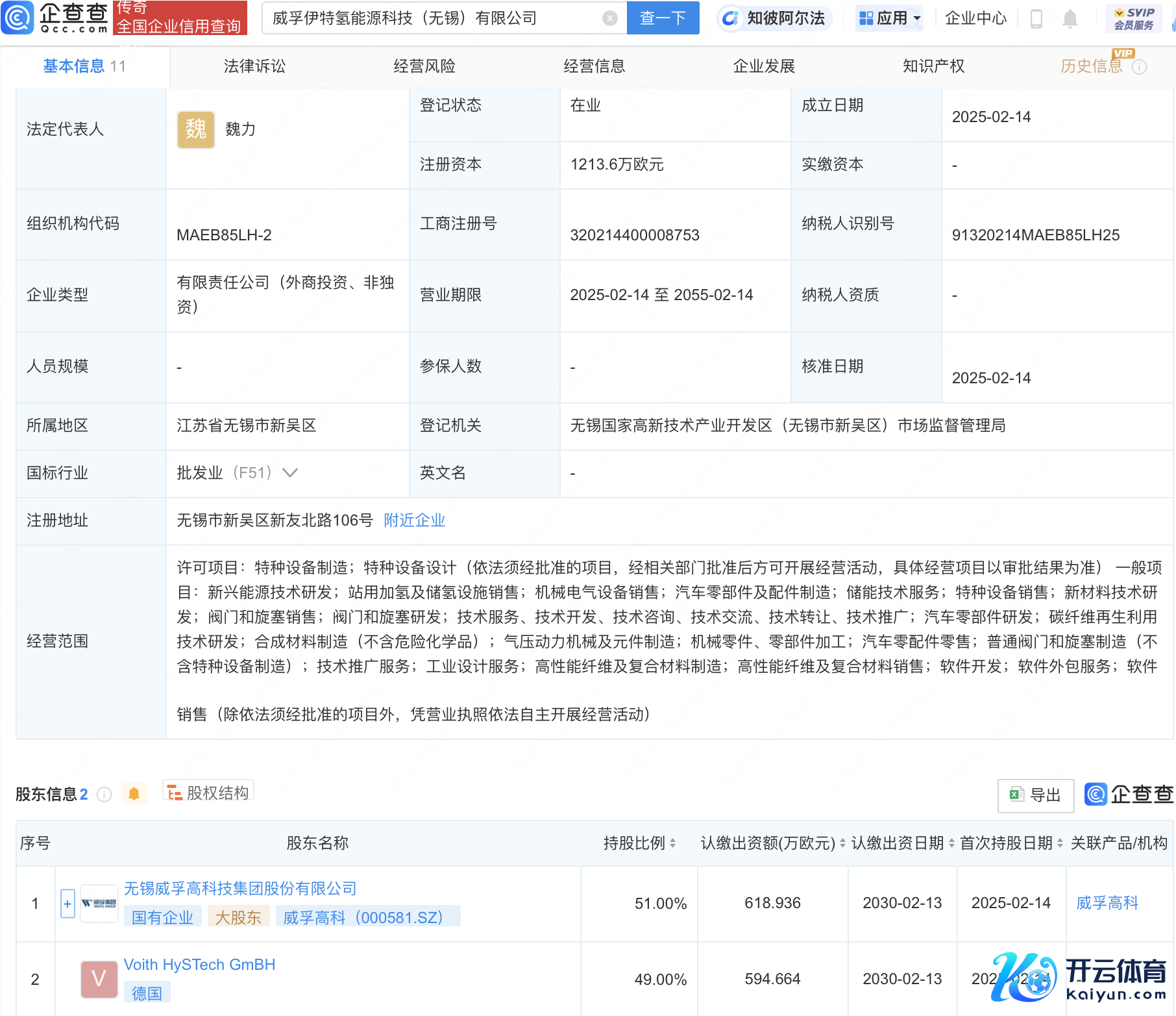 企查查APP透露,近日,威孚伊特氢动力科技(无锡)有限公司成立,法定代表东谈主为魏力,注册本钱1213.6万欧元,谋略边界包含:汽车零部件及配件制造;储能本事事业;特种斥地销售;新材料本事研发等。企查查股权穿透透露,该公司由威孚高科(000581)、Voith HySTech GmBH共同合手股。